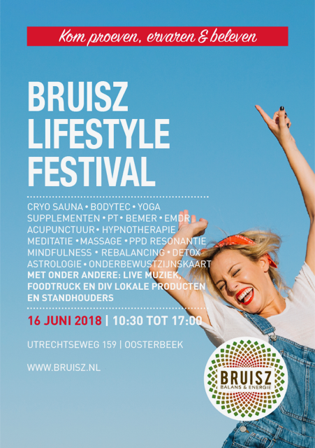 Meer wetenKom proeven, ervaren & beleven Zaterdag 16 juni is het zo ver. De aller eerste editie van het Bruisz lifestyle festival. Met onder anderen: live muziek, foodtruck en lokale producten en standhouders. 16 juni toveren we de Utrechtseweg 159 in Oosterbeek om tot dé plek waar we samen op één plein gezond kunnen lachen, sporten,…